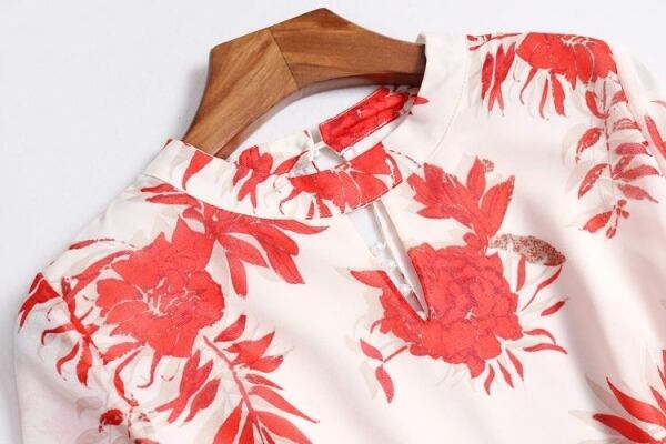 白地に赤の花が鮮やかに描かれたドレスです。形もお洒落で周りと被りたくないときにもピッタリのデザインです。