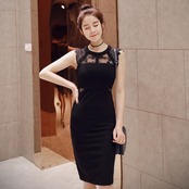 ノースリーブのシースルー花柄レースブラックタイトワンピースのご紹介です。トップス部分とウエスト部分のシースルーと花柄レースが上品な肌見せで女らしさを演出。シンプルなひざ丈タイトワンピースなのでお呼ばれなどのきちんとシーンや結婚式、二次会、パーティにオススメです。