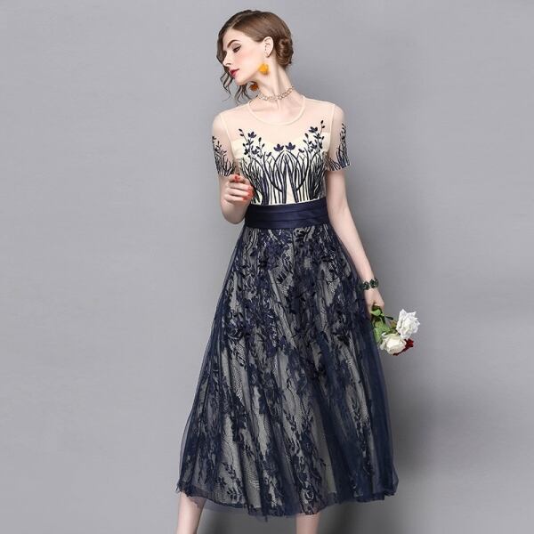 半袖シースルーの花柄刺繍入りレースドレスのご紹介です。シースルー部分の花柄刺繍とスカート部分の花柄レースがエレガントで上品。ミモレ丈のスカートはウエストマークで美シルエット。お呼ばれなどのきちんとシーンやパーティ、結婚式、二次会などにもオススメの1着です。