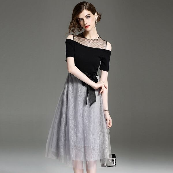 シックなブラックとグレーのバイカラーが大人っぽい雰囲気を演出しれくれるシンプルなパーテイー向けドレス。大人っぽい印象の1着です。