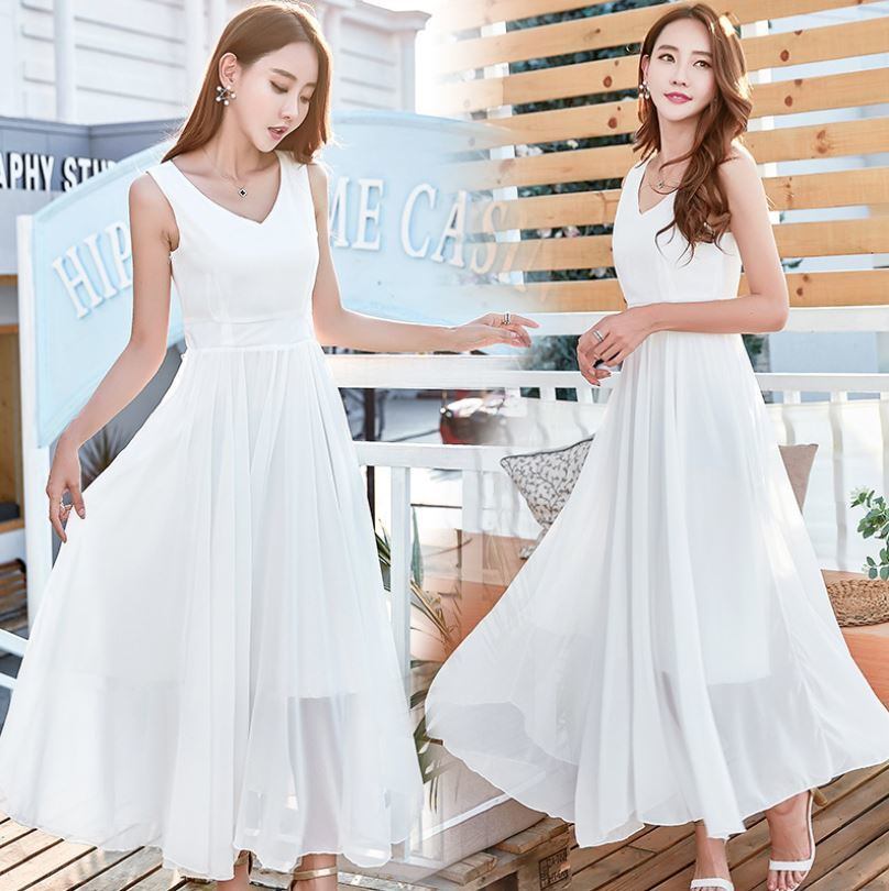 フェアリーなハイウエスト Vネックのゆったり ホワイト シンプルなノースリーブ ロングドレス ☆エレガント 大人 上品 かわいい 清楚 きれい 結婚式二次会 お呼ばれ 2018年新作 婚活パーティー フォーマルドレス 披露宴 結婚式ドレス ウェディング 結婚式 謝恩会 パーティードレス 発表会 演奏会 記念日 【621】