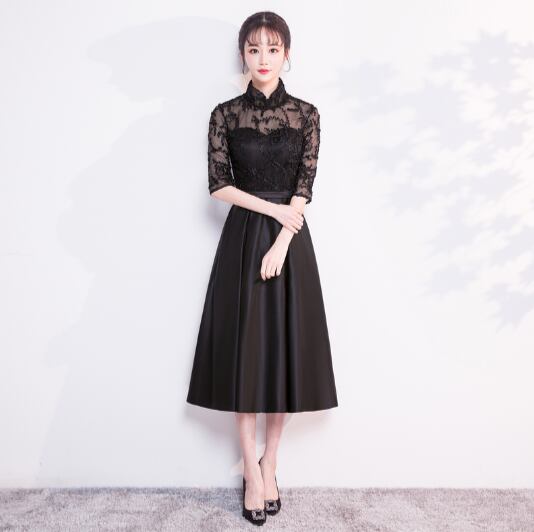 五分袖レース☆Aライン ブラックミモレ丈 イブニングドレス☆インスタ映え エレガント 大人 上品 かわいい 清楚 きれい 結婚式二次会 お呼ばれ 2018年新作 婚活パーティー フォーマルドレス 披露宴 結婚式ドレス ウェディング 結婚式 謝恩会 パーティードレス 発表会 演奏会 記念日【401】