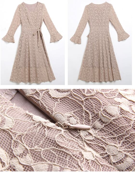 ラッパ袖☆長袖 花柄レース ミモレ丈ワンピースドレス ☆エレガント 清楚 きれい 大人 上品 2018年新作 フォーマルドレス ウェディング 謝恩会 結婚式 二次会 パーティー お呼ばれ お出かけ【432】