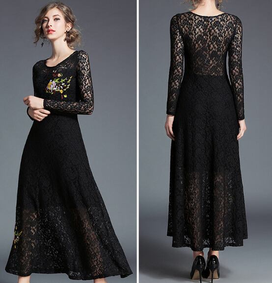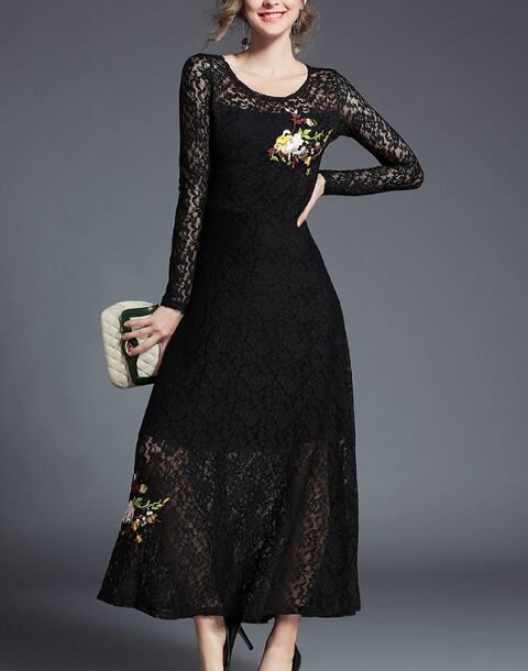 刺繍がカワイイ☆長袖レースのAラインワンピースドレス☆エレガント 大人 上品 2018年新作 フォーマルドレス ウェディング 謝恩会 結婚式 二次会 パーティー お呼ばれ お出かけ【463】