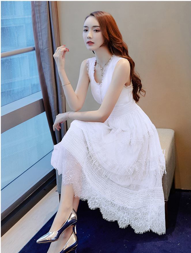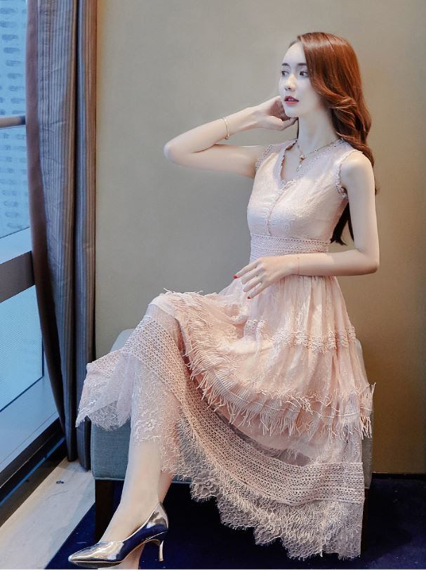 Vネック ノースリーブ ハイウエストのシックなスカートのレースドレス エレガント 大人 上品 結婚式二次会 お呼ばれ 2018年新作 婚活パーティー フォーマルドレス 披露宴 結婚式ドレス ウェディング 結婚式 謝恩会 パーティードレス 発表会 演奏会【629】