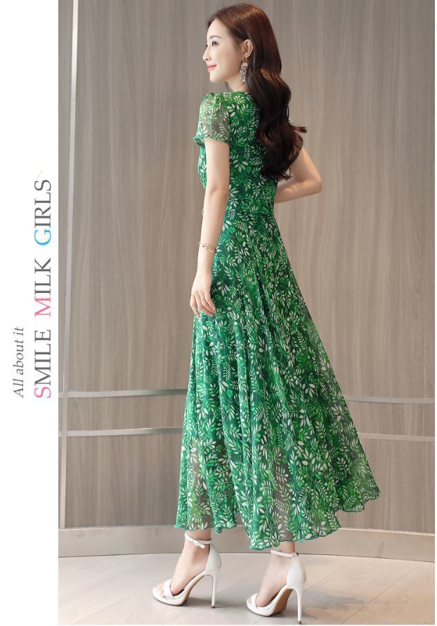 シフォン プリント半袖 クルーネック ロングフレアスカート ドレス エレガント 大人 上品 結婚式二次会 お呼ばれ 2018年新作 婚活パーティー フォーマルドレス 披露宴 結婚式ドレス ウェディング 結婚式 謝恩会 パーティードレス 発表会 演奏会【634】