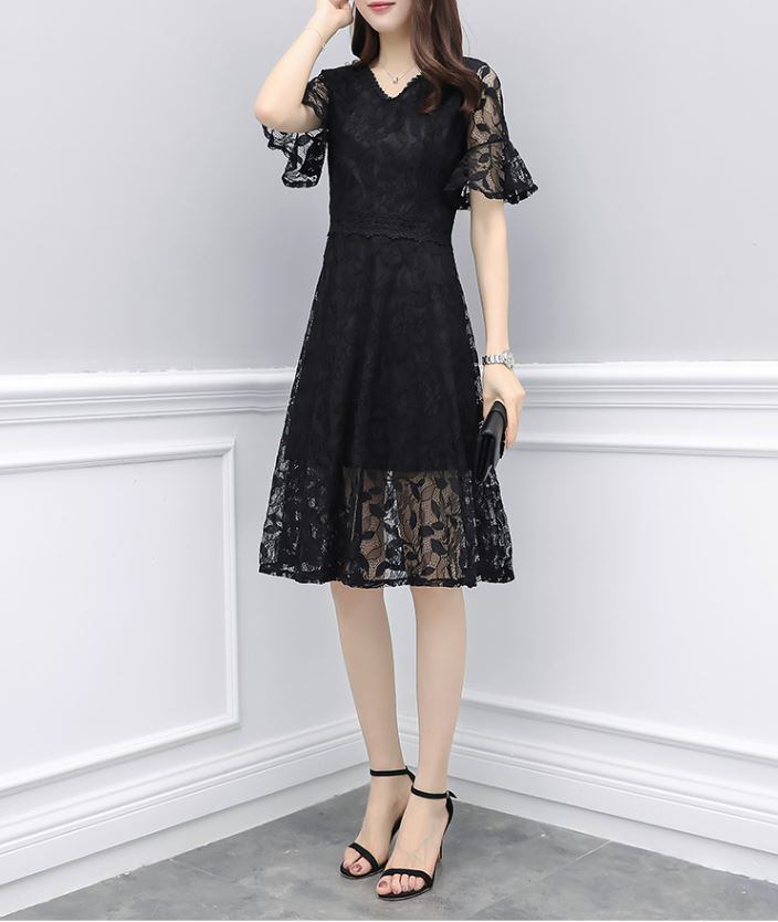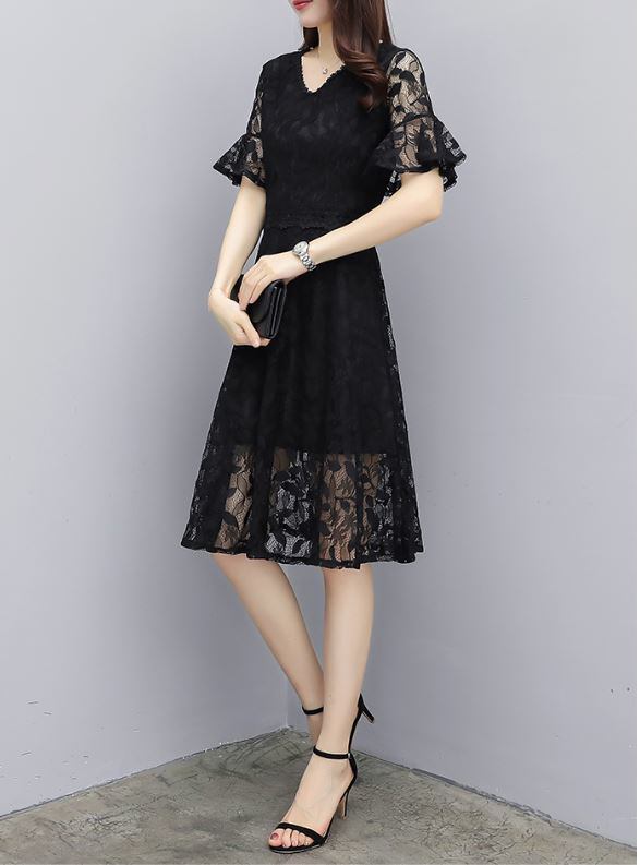 Vネック ラッパ袖 Aライン 透かし柄 レース ワンピース エレガント 大人 上品 2018年新作 婚活パーティー フォーマルドレス 披露宴 結婚式ドレス ウェディング 結婚式 謝恩会 パーティードレス 演奏会 結婚式 二次会 パーティー お呼ばれ お出かけ 【668】