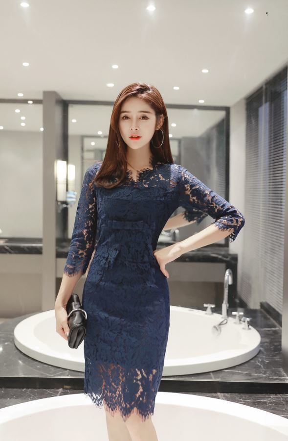 レース Vネック スリム 7分袖 ドレス パーティー エレガント 大人 上品 結婚式二次会 お呼ばれ 2018年新作 婚活パーティー フォーマルドレス 披露宴 結婚式ドレス ウェディング 結婚式 謝恩会 パーティードレス 【693】