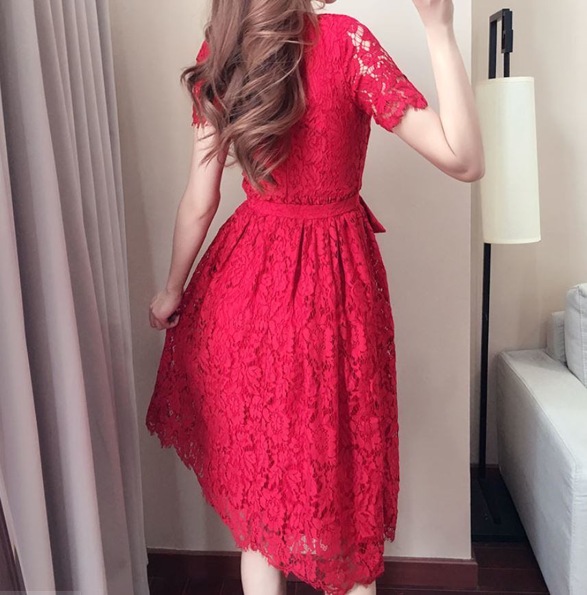 レース 半袖 ウエストリボン ドレス 結婚式 二次会 パーティー お呼ばれ お出かけ 【694】