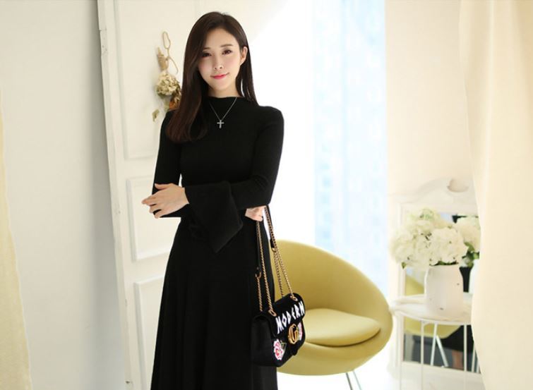 ミモレ丈ワンピース トランペットスリーブ 長袖 ニットドレス エレガント 大人 上品 結婚式二次会 お呼ばれ 2018年新作 婚活パーティー フォーマルドレス 披露宴 結婚式ドレス ウェディング 結婚式 謝恩会 パーティードレス 【718】