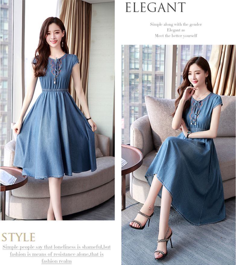 ミモレ丈ワンピース デニム ショートスリーブ ラウンドネック エレガント 大人 上品 結婚式二次会 お呼ばれ 2018年新作 婚活パーティー フォーマルドレス 披露宴 結婚式ドレス ウェディング 結婚式 謝恩会 パーティードレス 【722】