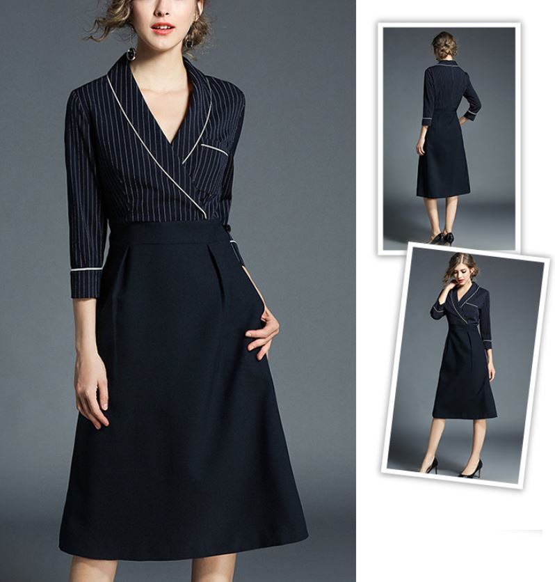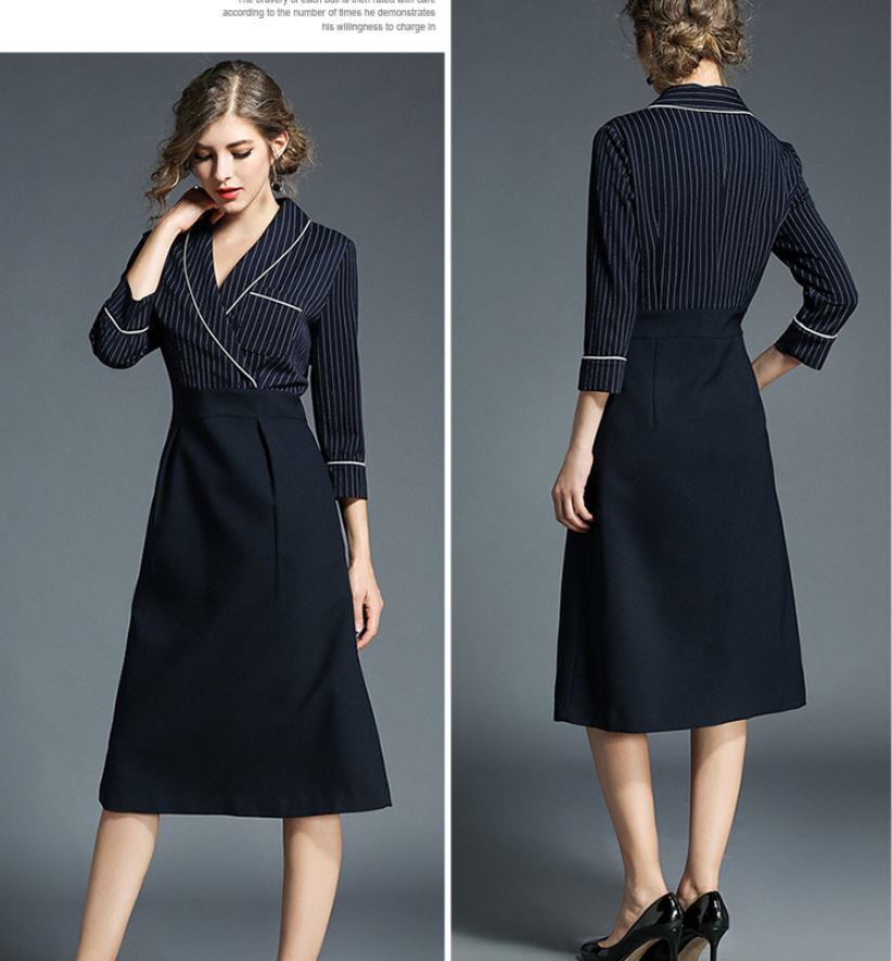 ミモレ丈ワンピース Vネック 7分袖 ストライプ ステッチ ドレス エレガント 大人 上品 結婚式二次会 お呼ばれ 2018年新作 婚活パーティー フォーマルドレス 披露宴 結婚式ドレス ウェディング 結婚式 謝恩会 パーティードレス 【745】