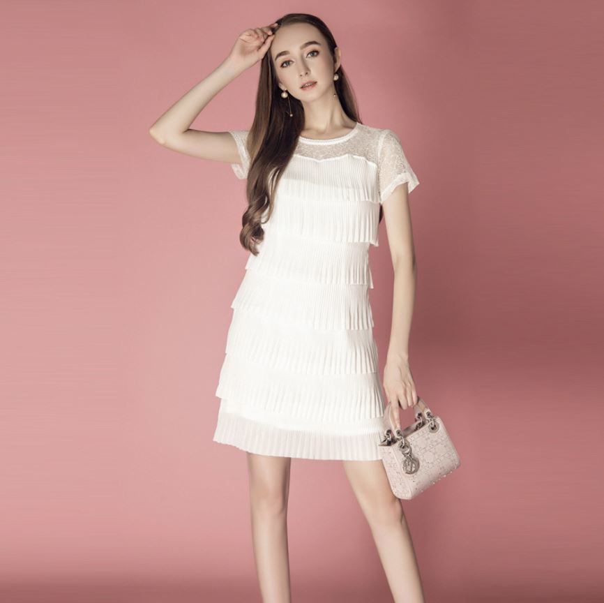 ショート丈ワンピース ラウンドネック レース ステッチ フリルドレス エレガント 大人 上品 結婚式二次会 お呼ばれ 2018年新作 婚活パーティー フォーマルドレス 披露宴 結婚式ドレス ウェディング 結婚式 謝恩会 パーティードレス 【757】