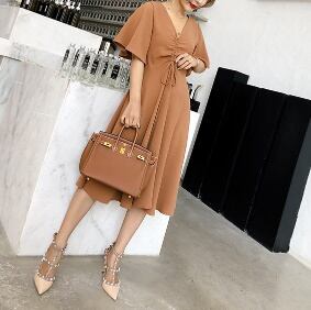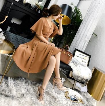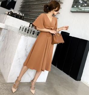 ブラウン Vネック ひざ丈 フロントリボン ワンピース リゾートドレス【534】