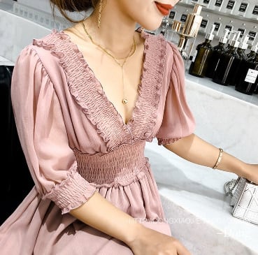 ボリューム袖とギャザー仕立てのウェストが
