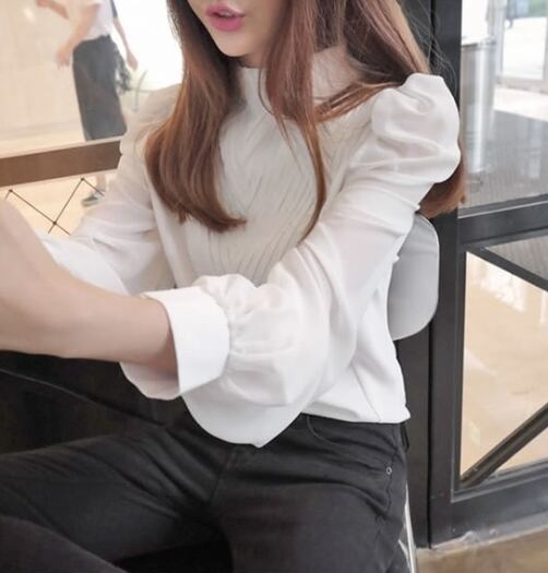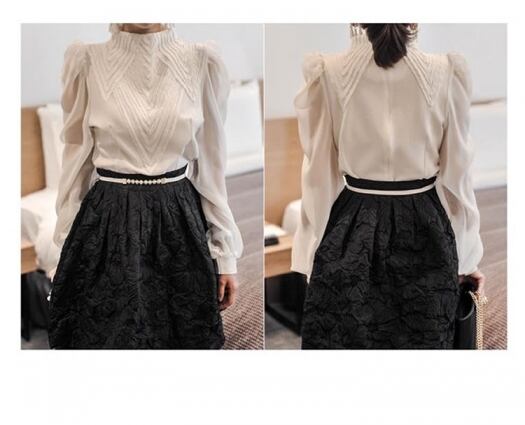 ボリューミーなパフスリーブが目を惹くブラウスはリッチなシフォン生地。