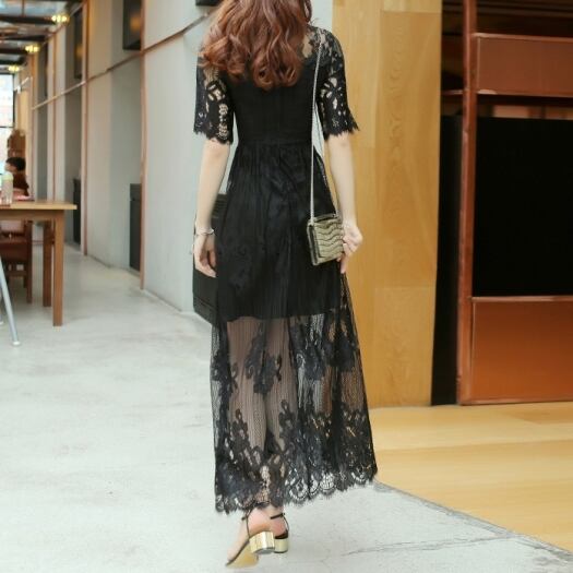 膝丈のタイトスカートに重ねられたレースのロングワンピースは