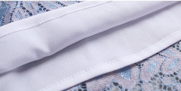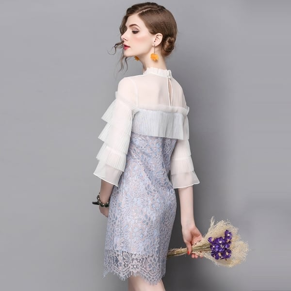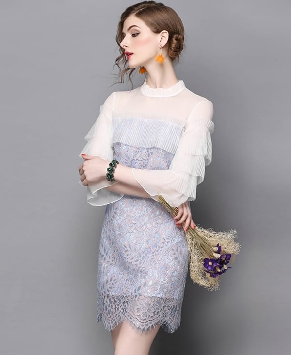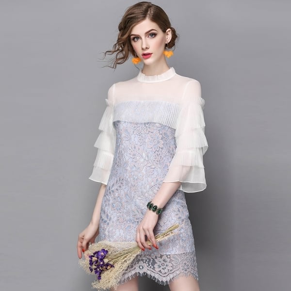 白×水色の色使いが清楚で可愛らしいデザインです。袖のフリルとスカート丈のデザインがとてもお洒落です。