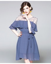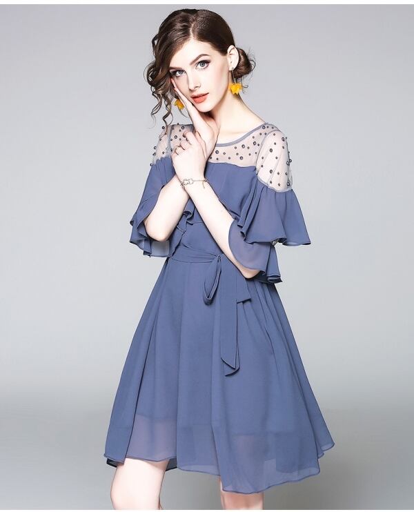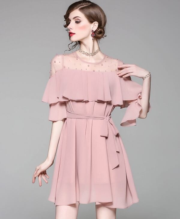 レース越しの見せ肌とラッフルフリルがエレガントなショート丈シフォンワンピースのご紹介です。