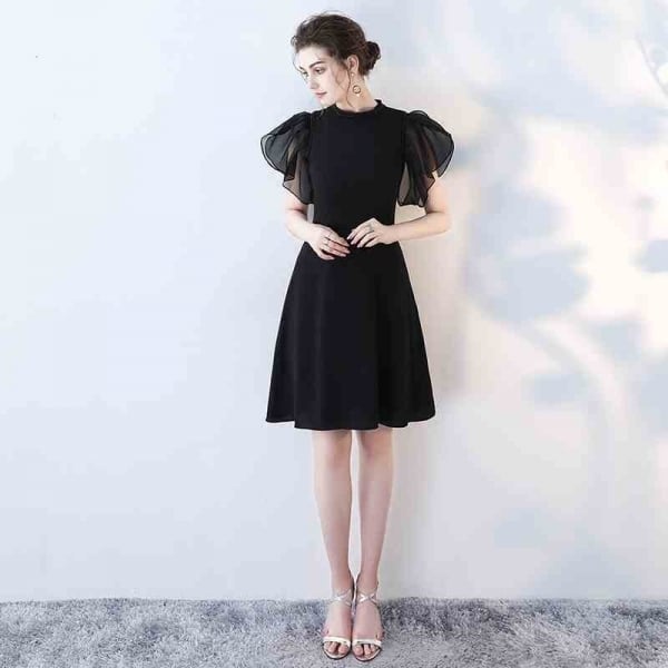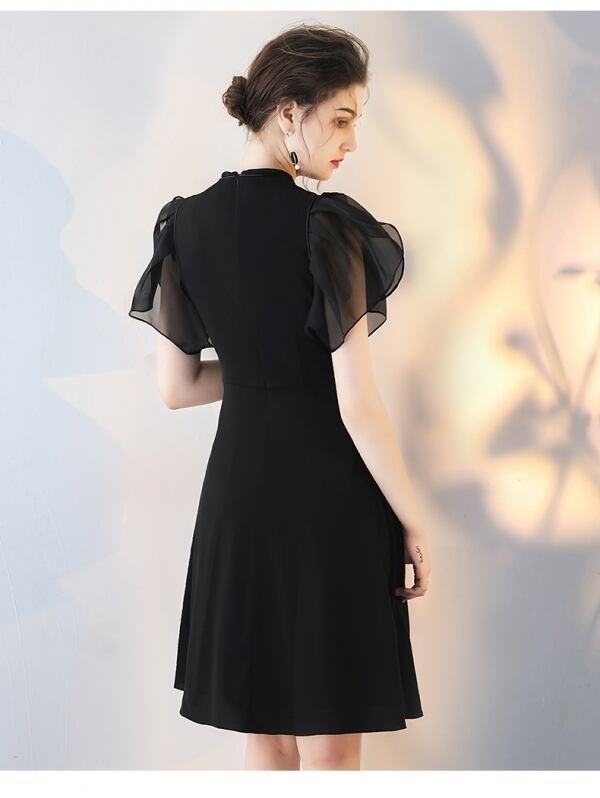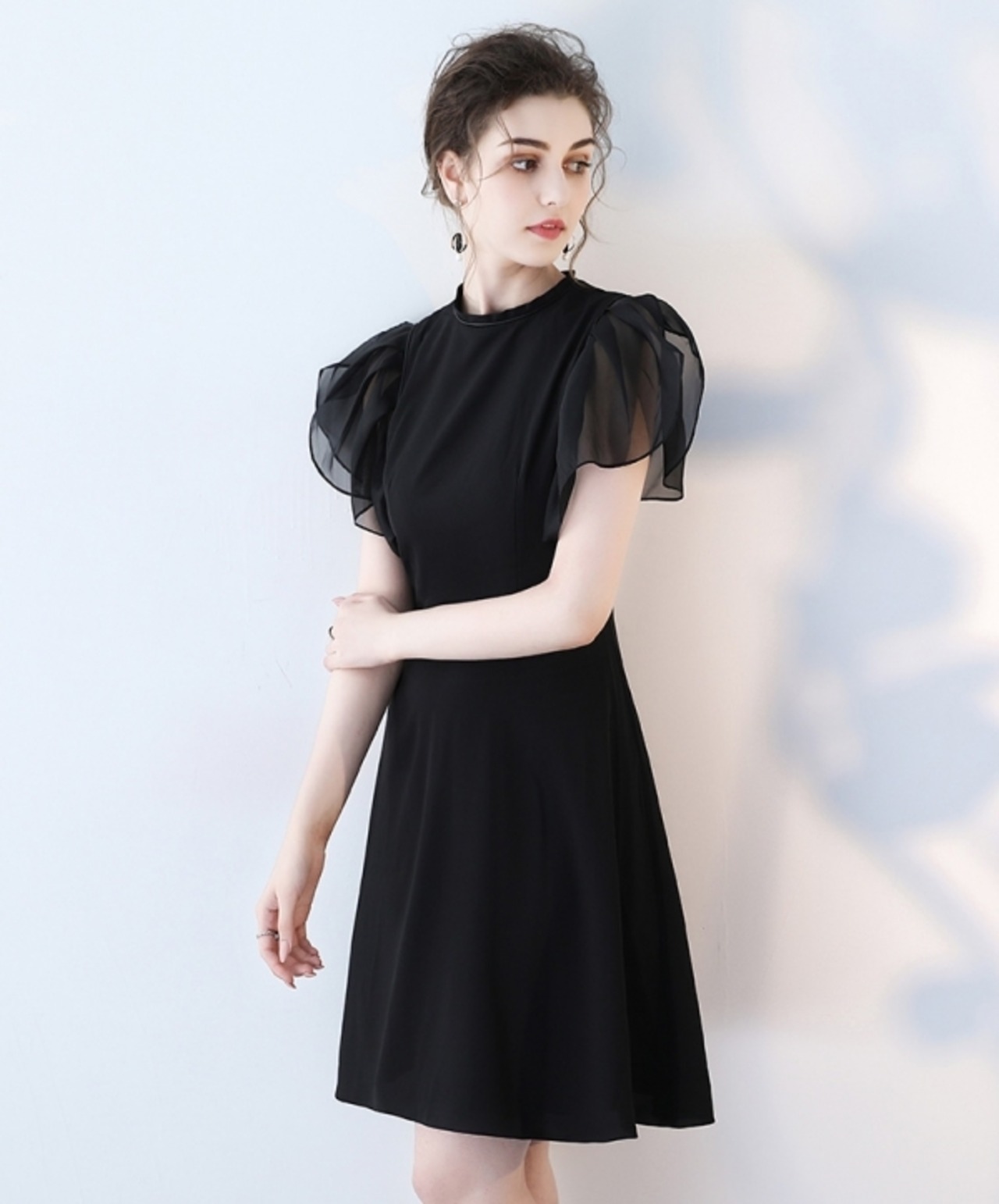 ふんわり袖レースが大人キレイを演出してくれるAラインひざ丈パーティードレスのご紹介です。