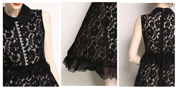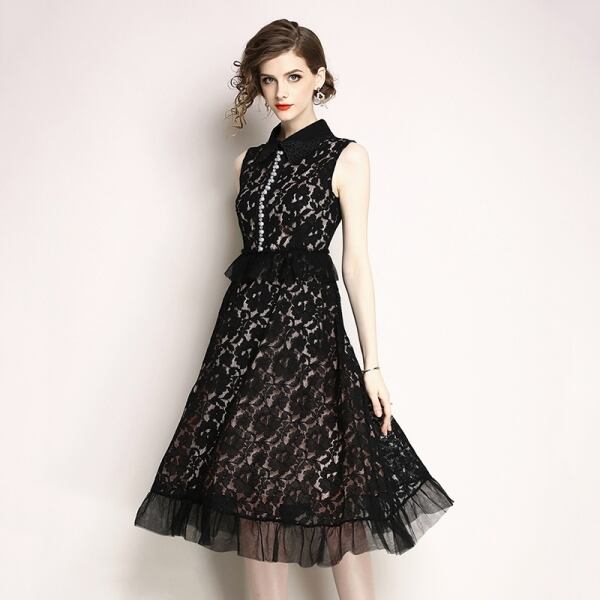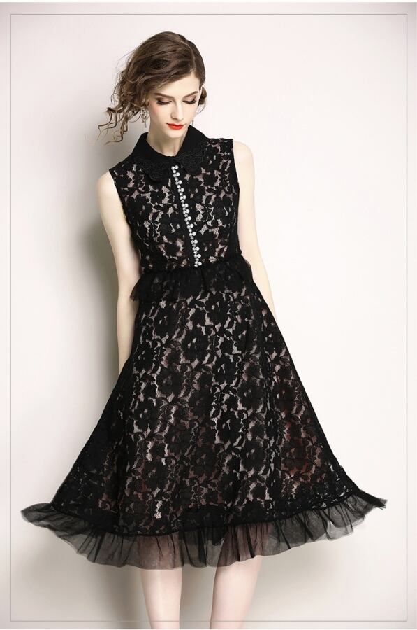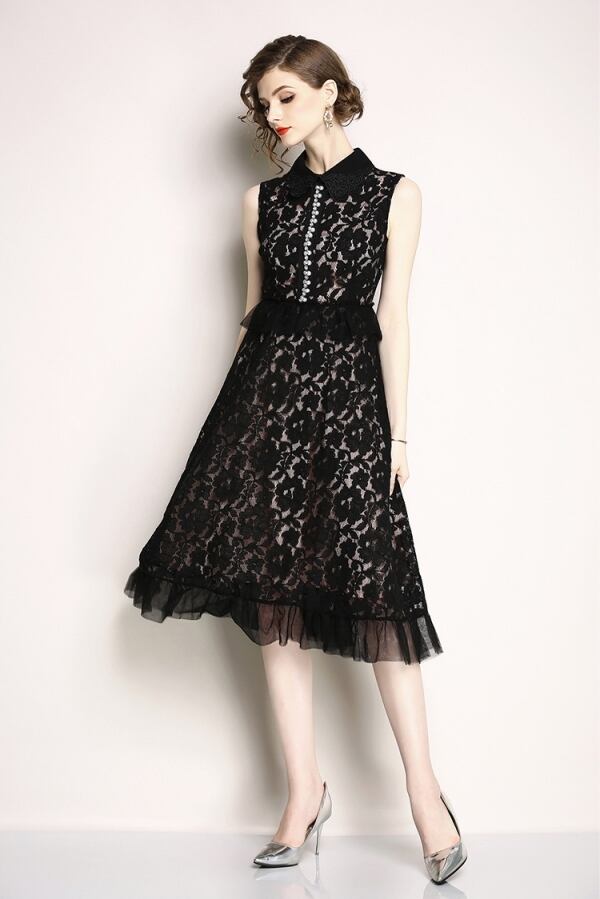 フラワーレース&裾とウエストのフリル&ビジューがエレガントなミモレ丈Aラインパーティードレスです。