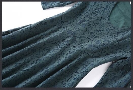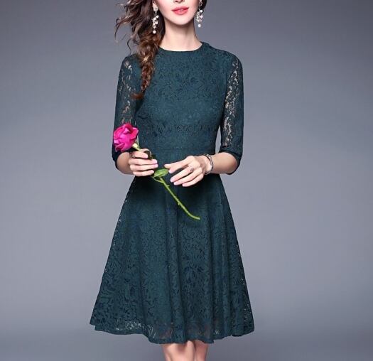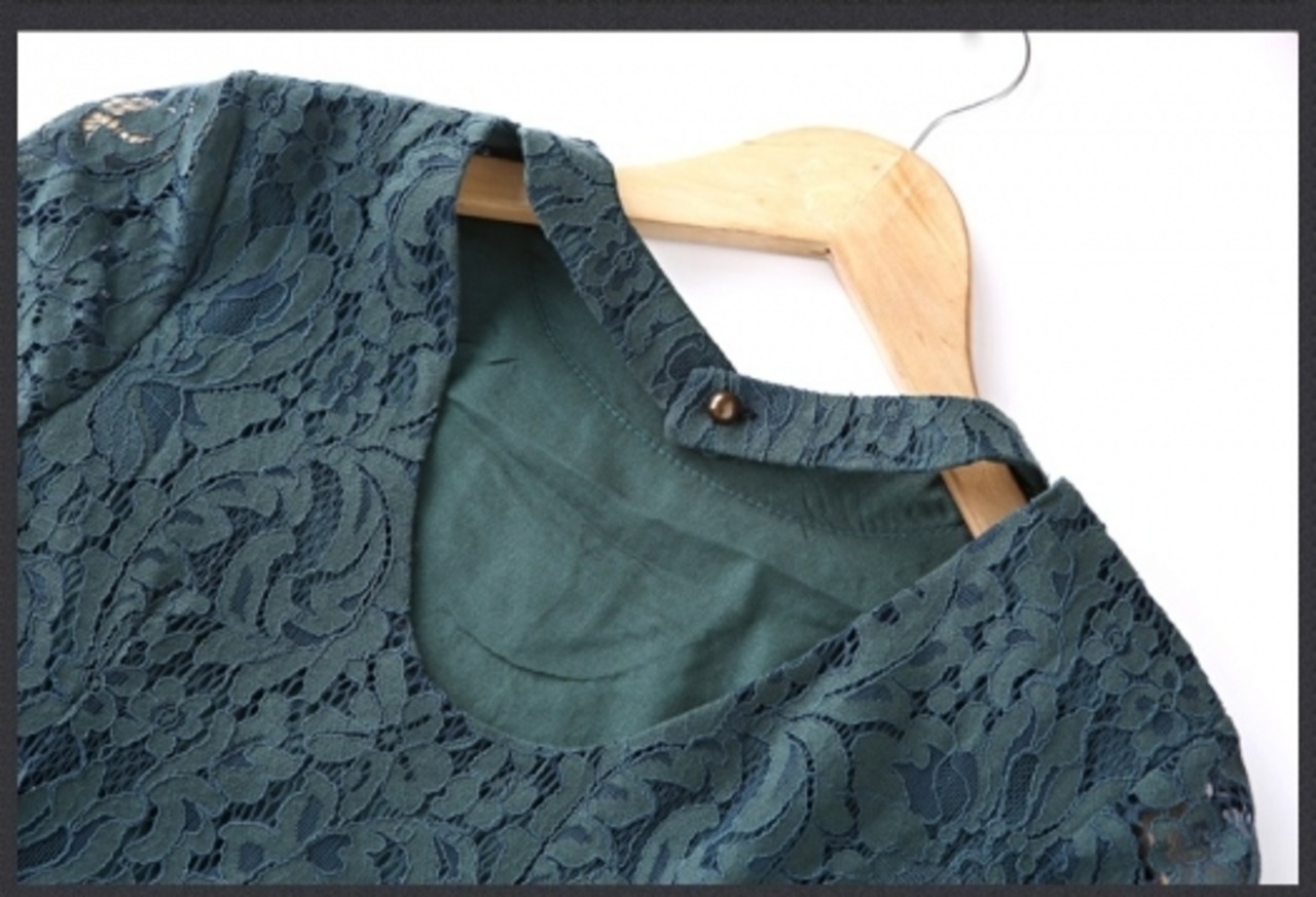 トレンドカラーである、深いグリーンのレースを使ったワンピース。