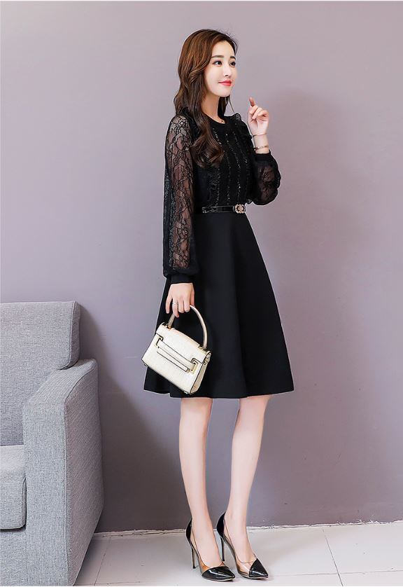 ミモレ丈ワンピース 長袖 レース ラウンドネック ハイウエスト ワンピース エレガント 大人 上品 結婚式二次会 お呼ばれ 2018年新作 婚活パーティー フォーマルドレス 披露宴 結婚式ドレス ウェディング 結婚式 謝恩会 パーティードレス K112