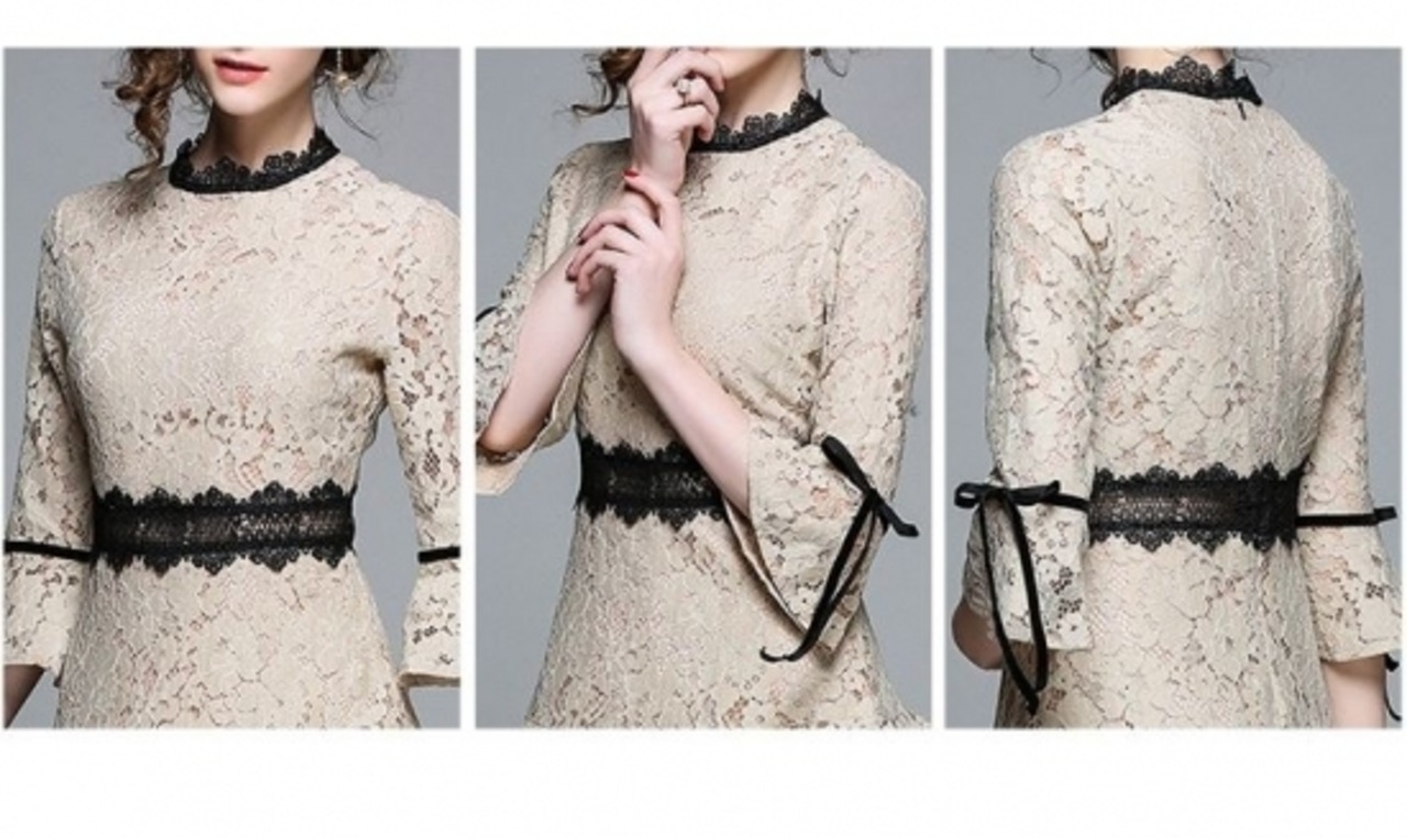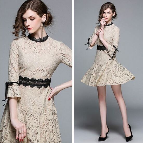 ベージュフレアワンピース Aライン七分丈 袖あり パーティ