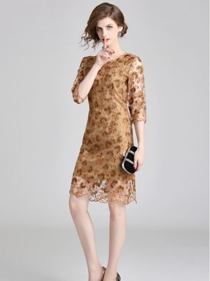 ブラウンワンピース パーティ フラワー刺繍 しなやか 大人顔
