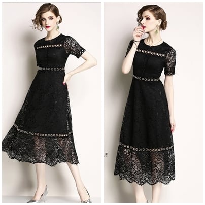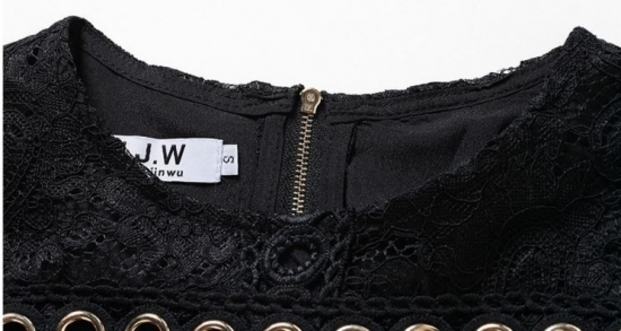 胸元、ウエスト部分、スカート部分のメタルリングが特徴で、上品な中にもロックテイストなスパイスが効いています!