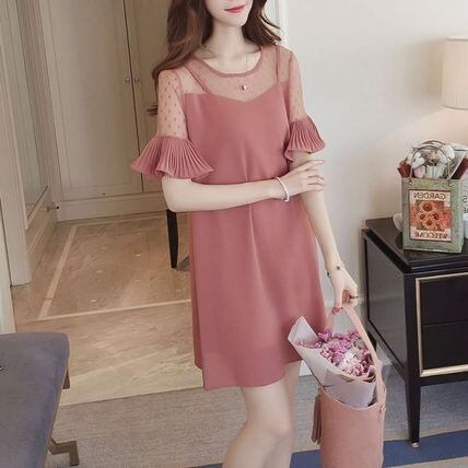 ピンク ドット シースルー フレア スリーブ ミニ ワンピース パーティードレス 結婚式 二次会 フォーマルワンピース 結婚式 お呼ばれ 披露宴 袖ありミニ丈 ワンピ 20代 30代 40代 演奏会 発表会 記念日 大きいサイズ ウェディング 謝恩会 入学式 レース 上品 華やか