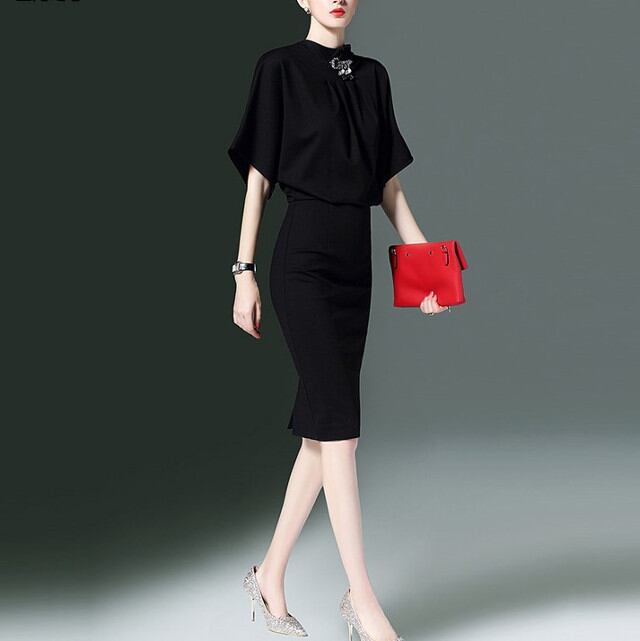 ブラック スタンドカラー ビジュー タイトライン スカート パーティドレス