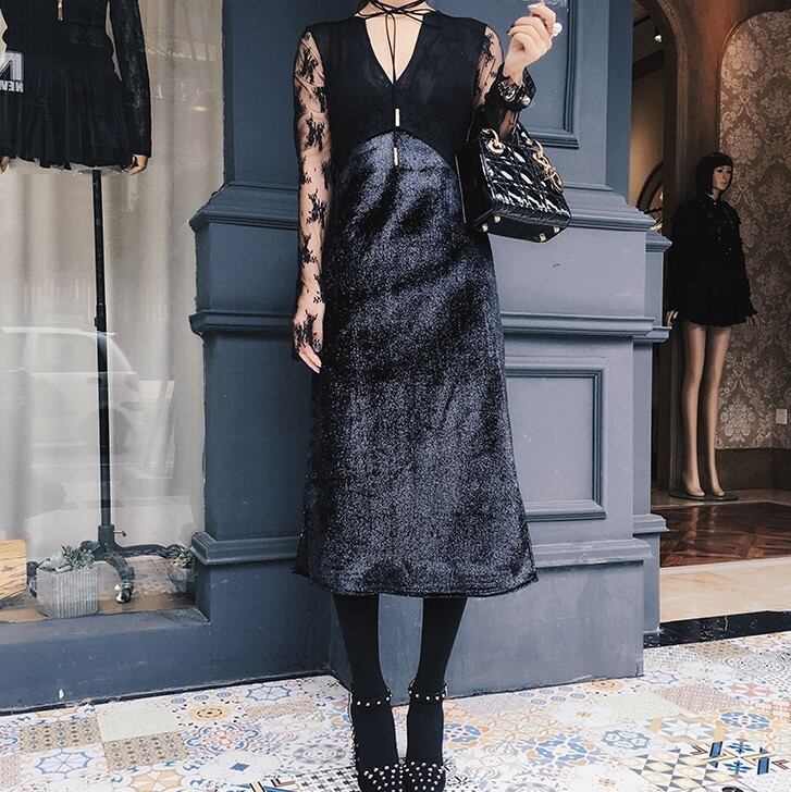 ブラック ロングスリーブ 深Vネック ひざ下 ラメ生地 パーティードレス ワンピース お出かけ お呼ばれ