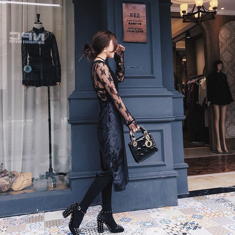 背中のシースルーとラメが編み込んだ光沢のあるスカート生地で、パーティー感満載の1枚。