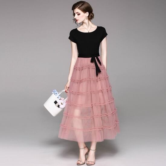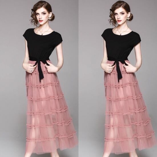 ブラックのカットソーにピンクのオーガンジー