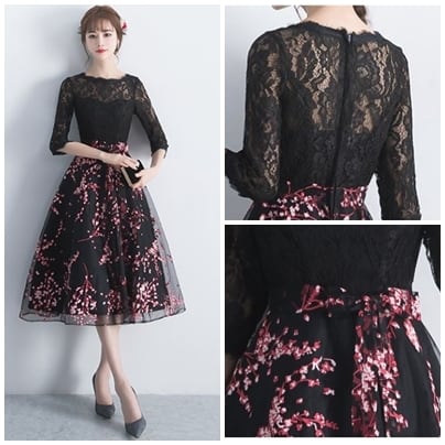 七分袖 ミディ丈 レース 切替 結婚式 ブライズメイド パーティードレス 清楚 大人女子【J61】