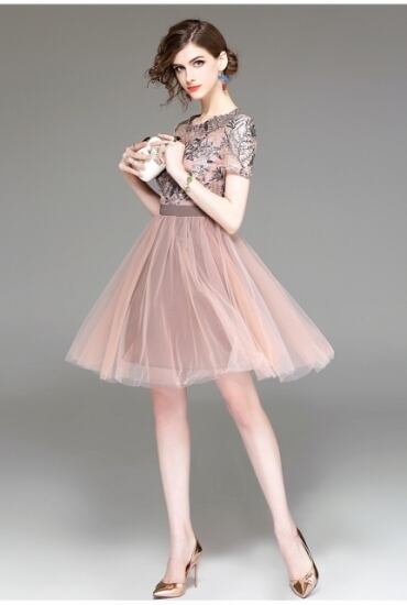 パーティードレス ワンピース ラウンドネック レース 刺繍 半袖 ひざ丈 結婚式 パーティー 二次会 披露宴【J69】