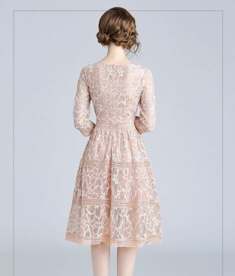 七分丈 レース ピンクベージュ 結婚式二次会 披露宴 パーティードレス お洒落さん 大人女子 お呼ばれ ブライズメイド【J86】