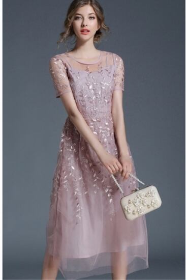 パーティードレス ワンピース ラウンドネック レース 刺繍 半袖 ミモレ丈 ロング丈 結婚式 パーティー 二次会 披露宴【J92】