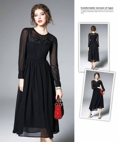 上品でシンプルなデザインにチャームポイント満載のロング丈のフレアーワンピースドレス。