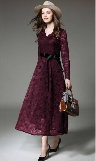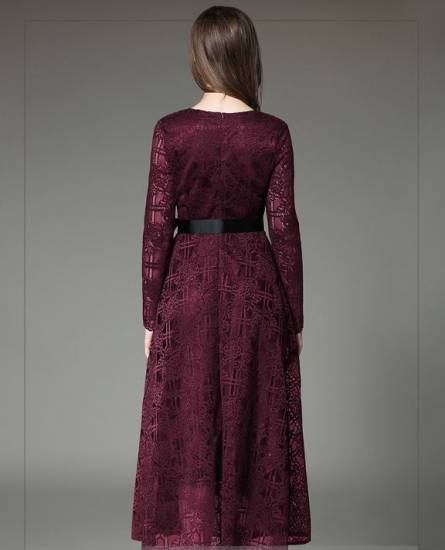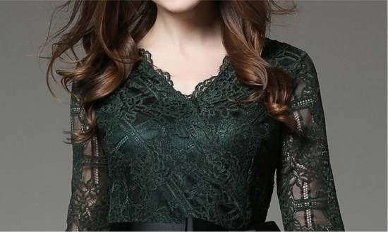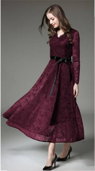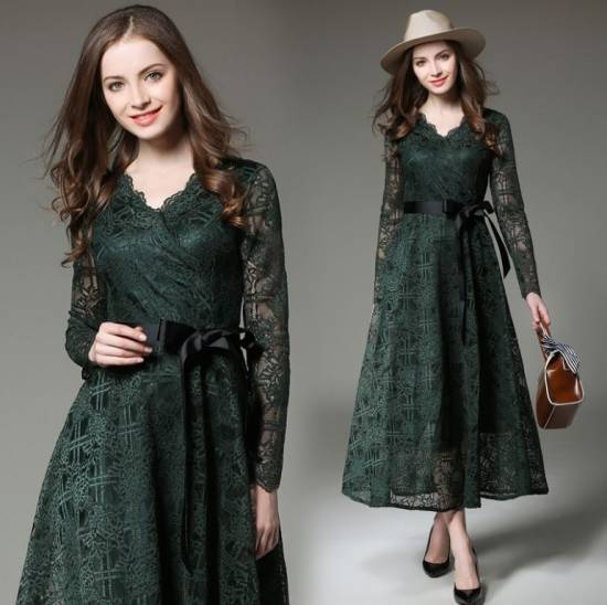 リボンを締めて、Aラインのシルエット、花柄のレースを飾って、スタイリッシュ感を有効にアップさせます。