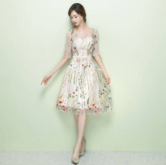 上品でフェアリーな印象のミディ丈のパーティードレス。