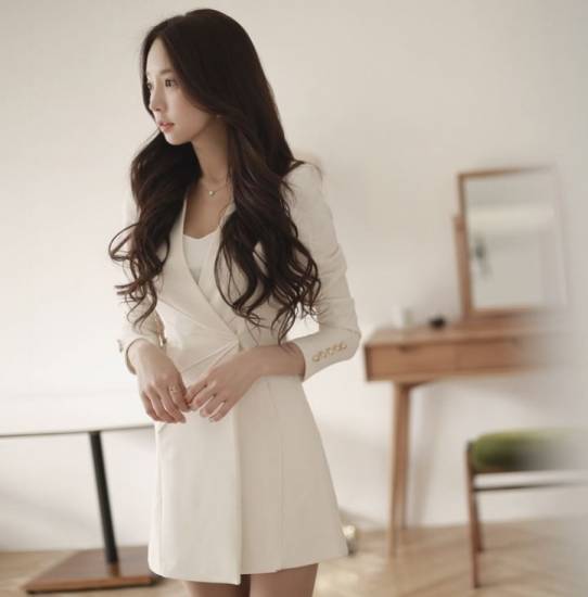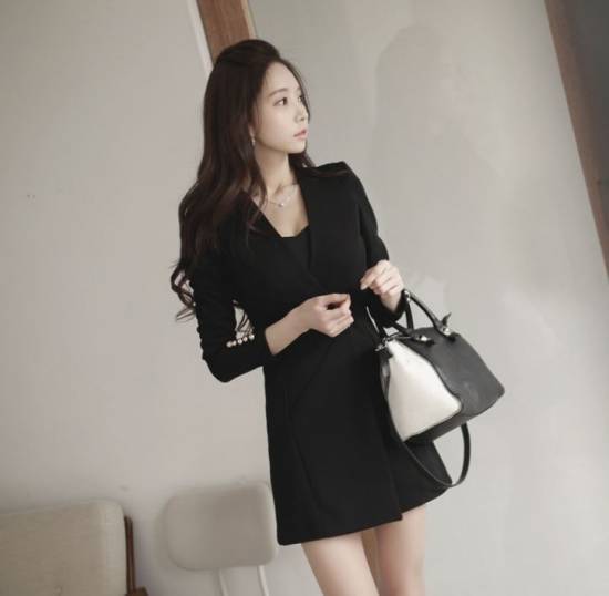 ノーカラーのロングジャケット見えする長袖ミニワンピ。