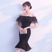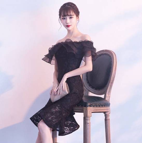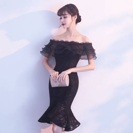 セクシーなオフショルダーのひざ丈フィッシュテイルドレス・ワンピースです。
