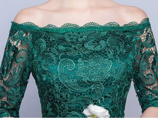 オフショルダーとボディラインに沿うタイトなラインとバックコンシャスな背中のレースアップが上品セクシー。