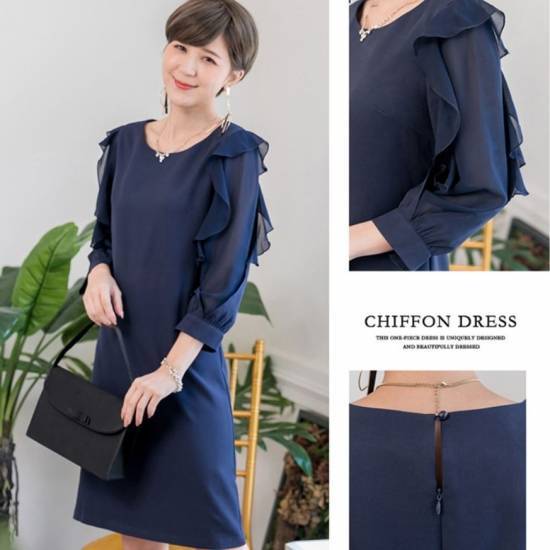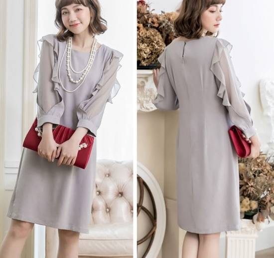 パーティードレス ワンピース 九分袖 ミディ丈 ミッドウエスト ラウンドネック シースルー 二次会 お呼ばれ 結婚式 パーティ