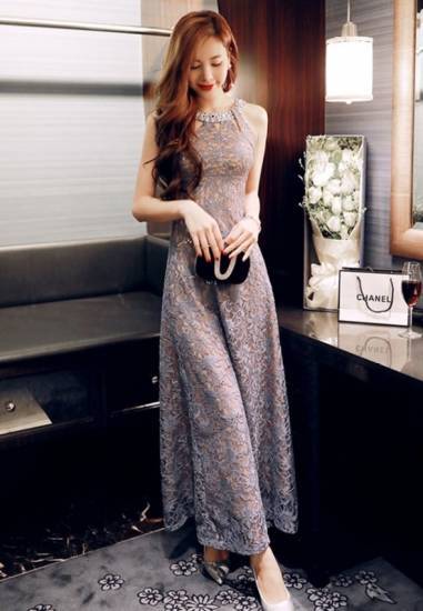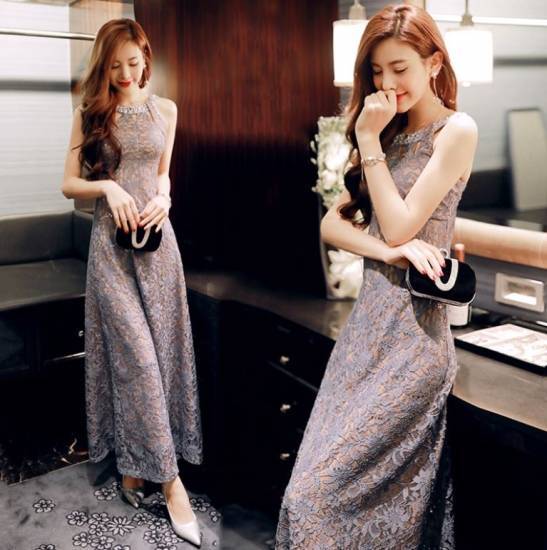 美しい立体総レースの軽いフレアロングスカートのワンピース! ハイウエストが脚長効果を演出します。
