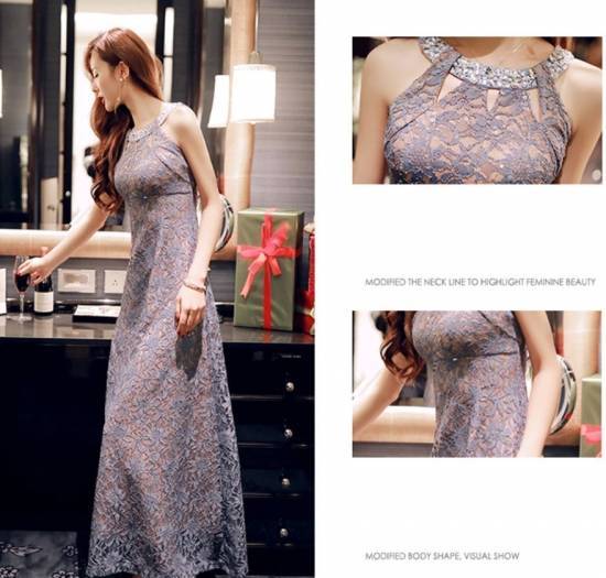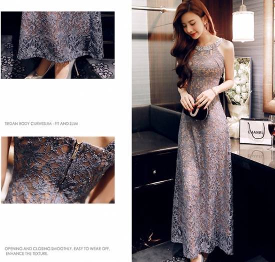 パーティードレス ワンピース レース 刺繍 七分袖 ロング丈 ハイウエスト ホルターネック シースルー 二次会 お呼ばれ 結婚式 パーティ