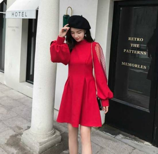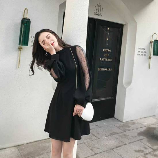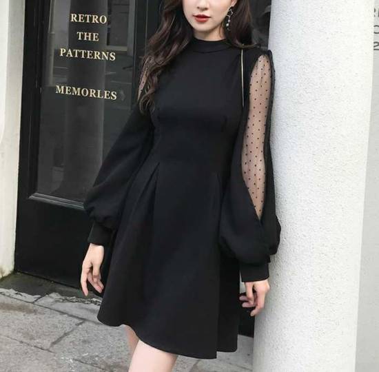 【人気商品‼︎】パーティードレス ワンピース メッシュ 長袖 ランタンスリーブ ショート丈 ミッドウエスト ハイネック シースルー 二次会 お呼ばれ 結婚式 パーティ