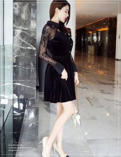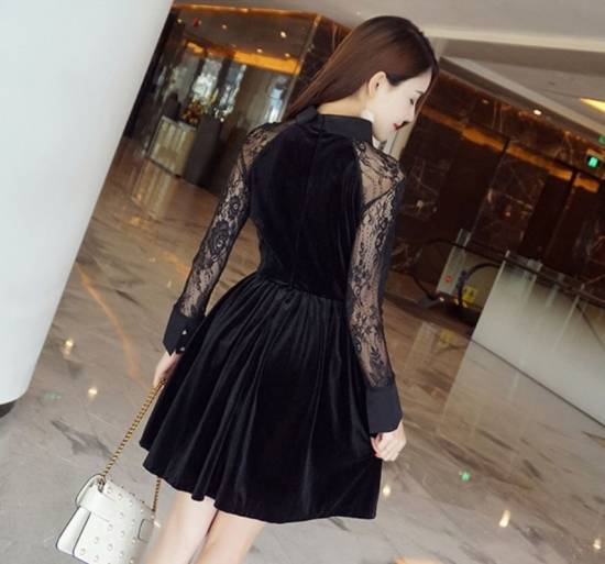 レースの長袖とベルベットのスカートのミニ丈ドレス。